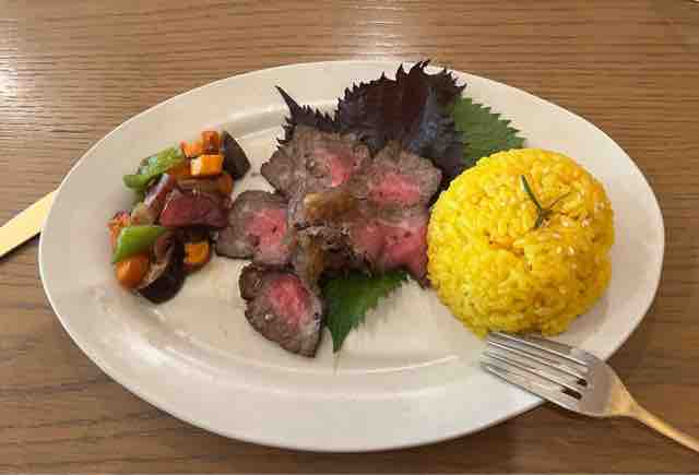 前にも頂いたことのあるカラフルプレートは、6種類の野菜に肉そぼろがサフランライスを囲んで盛り付けられています。
