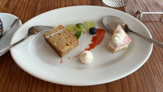 チョット食べちゃいましたが、デザートは紅茶のパウンドケーキとムースの盛り合わせが出て来ました。お皿にはマスカットやブルーベリー、柑橘系の果物などが添えてあり、お腹がはち切れそうに一杯でしたが、デザートは別腹らしくてペロリと食べちゃいました⁈