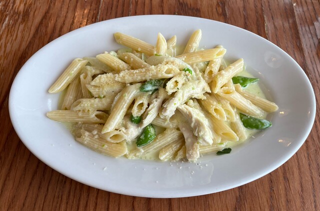 ③国産鶏胸肉と新玉葱、スナップエンドウのクリームソース(ペンネ)