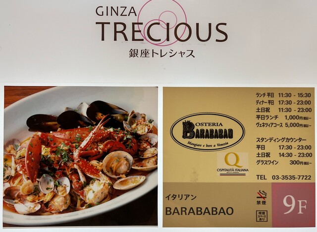 本日は、銀座二丁目の銀座トレシャスビル9階に在る「OSTERLA BARABABAO」で頂きます。